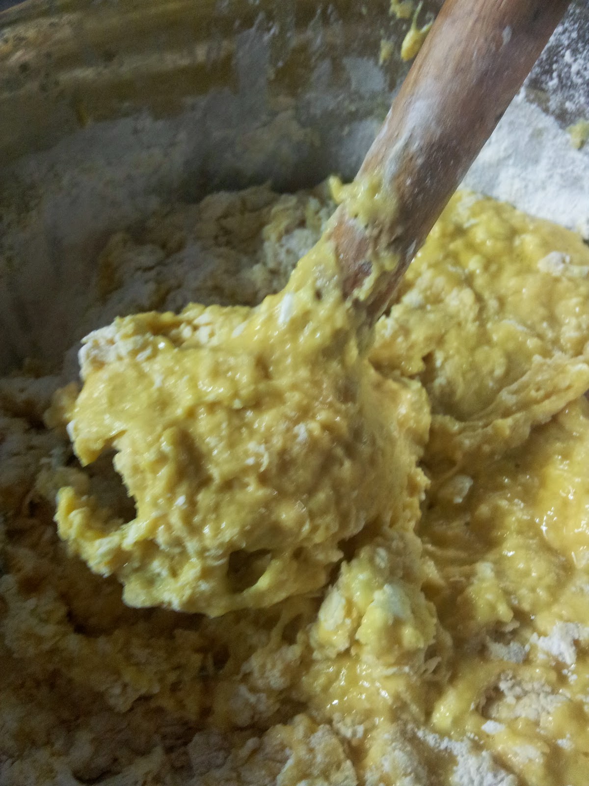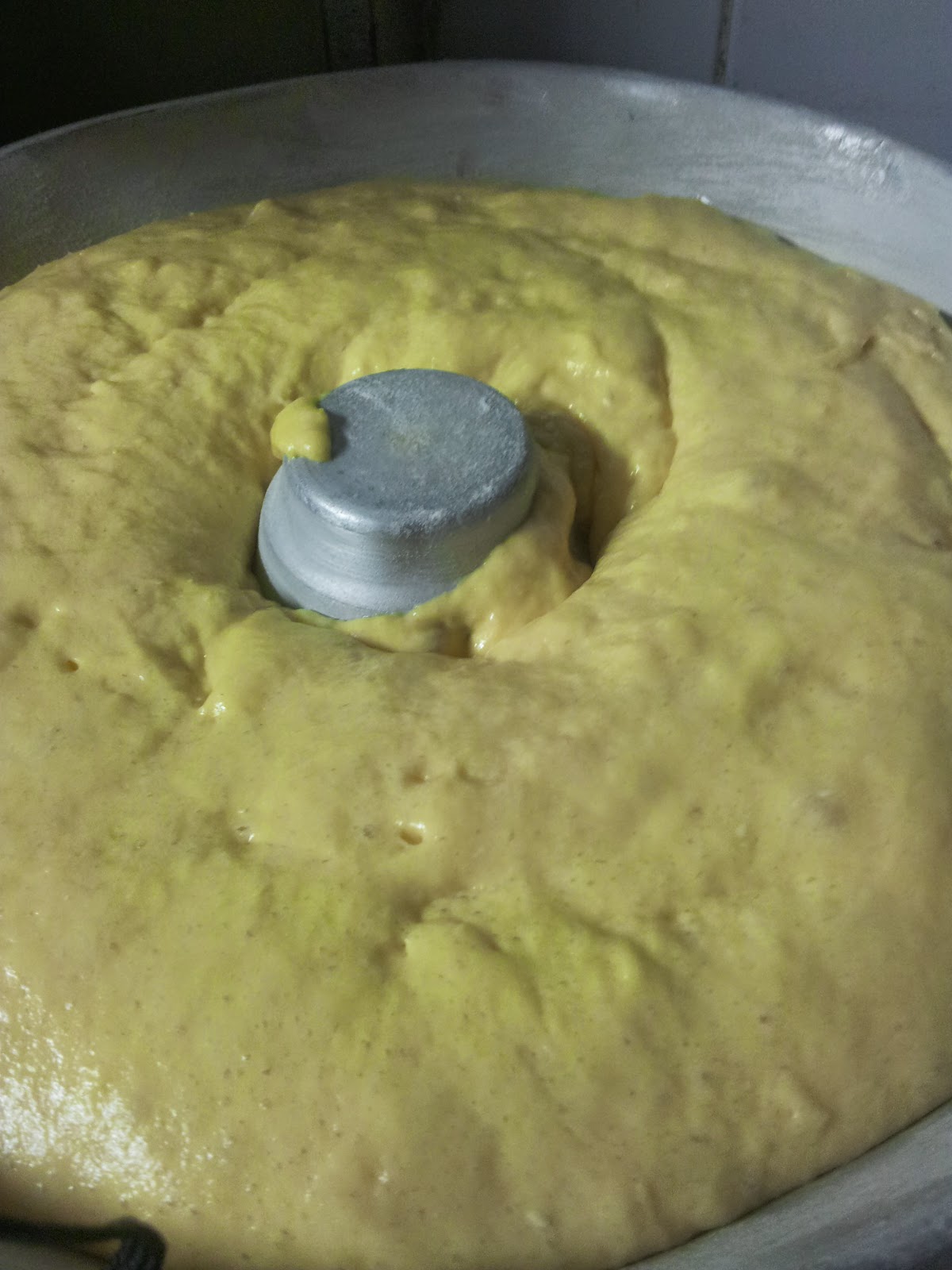 | mettere l'impasto, che deve essere morbido e appiccicoso nella teglia ad anello imburrata e infarinata |