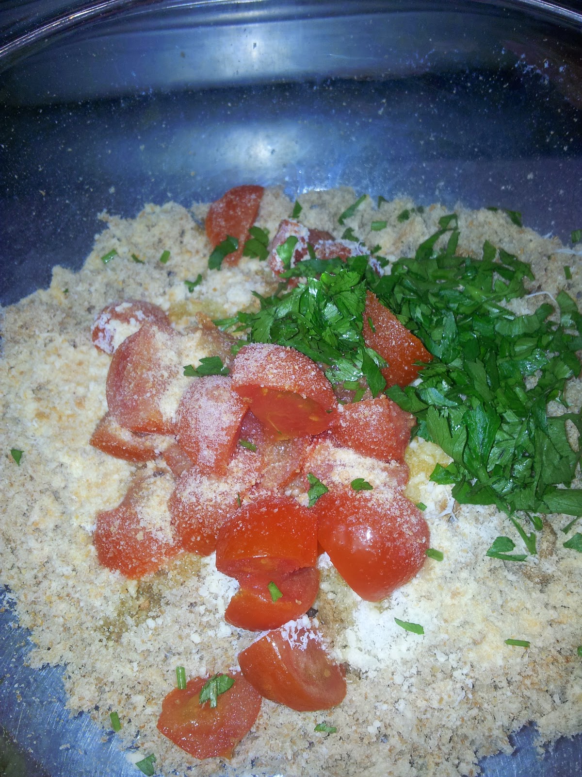 | unisci il formaggio, i pomodorini a pezzetti, il prezzemolo, l'aglio a pezzetti, sale, pepe e olio evo e impasta |