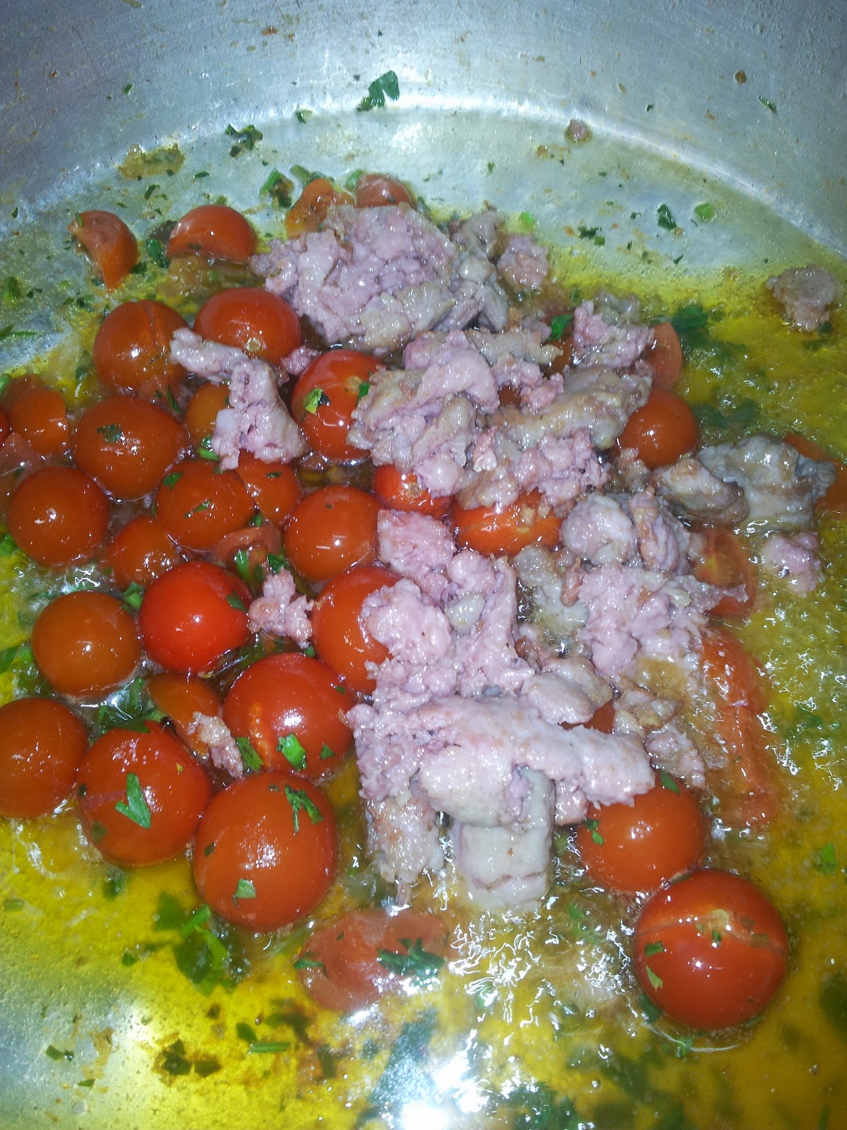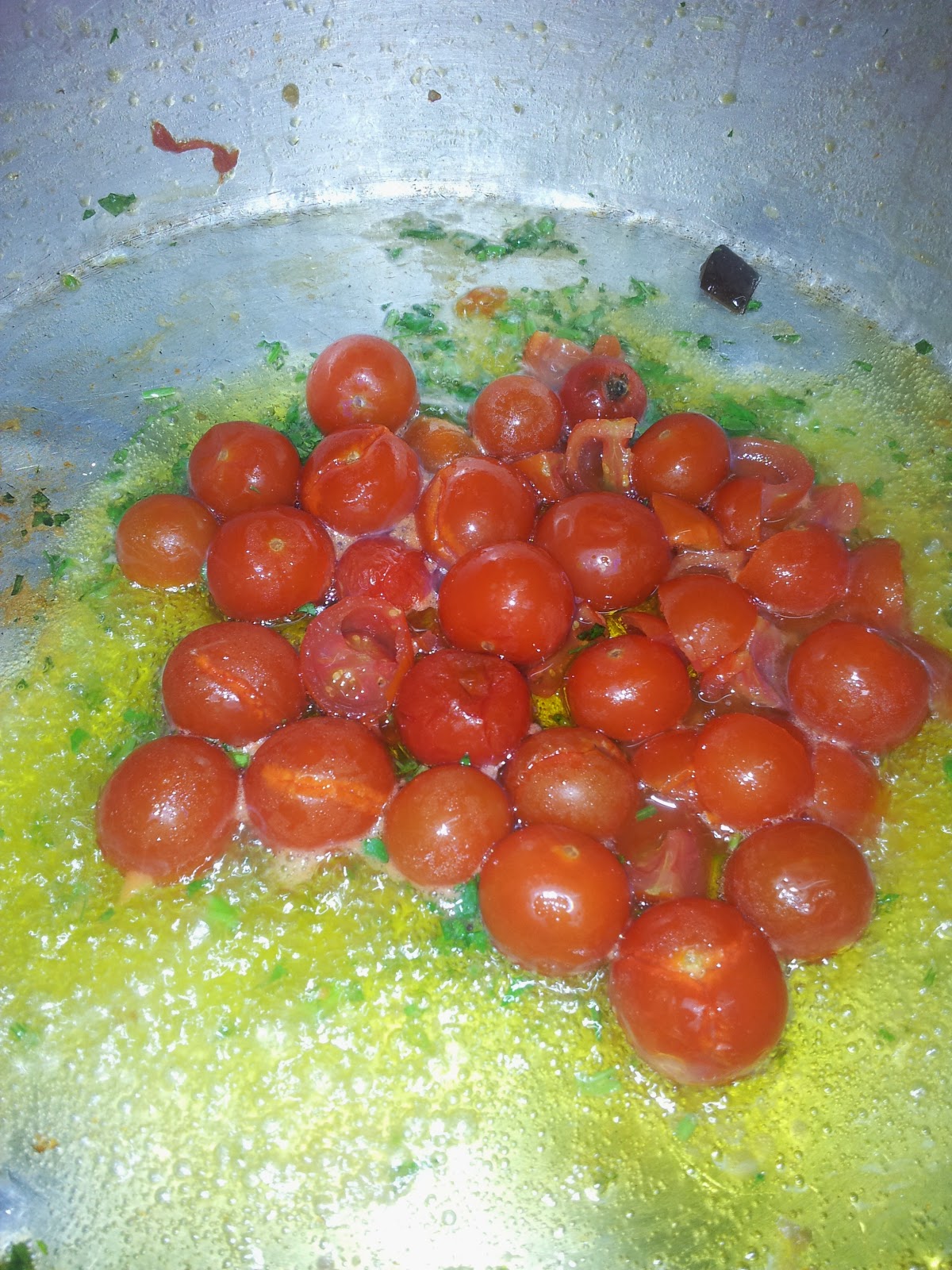 | Metti l'acqua della pasta sul gas e nell'attesa che esca il bollore soffriggi l'aglio, toglilo e butta i pomodorini interi e cuocili a fuoco vivace |