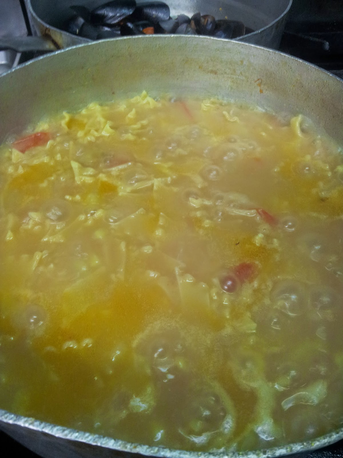 | in un altro tegame fare una zuppetta di cozze e pomodori, giusto il tempo di aprire i mitili, poi toglierli e aggiungere il brodetto alla base di patate e pomodorini |