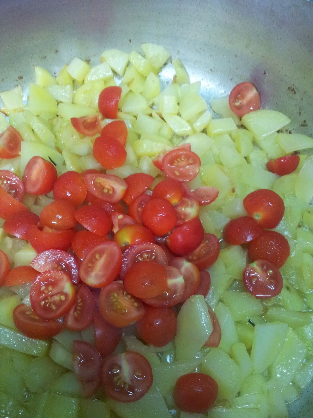 | aggiungi le patate a tagliate a quadretti con i pomodorini freschi tagliati a metà... non salare, in quanto il brodo è di per se già salato, e le cozze daranno ulteriore sapore |