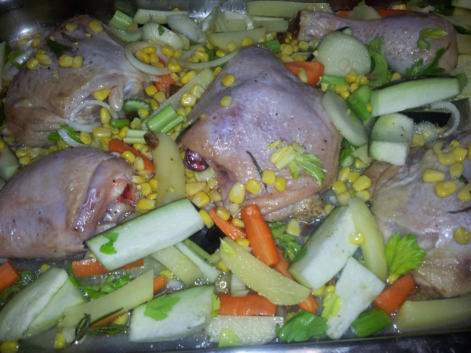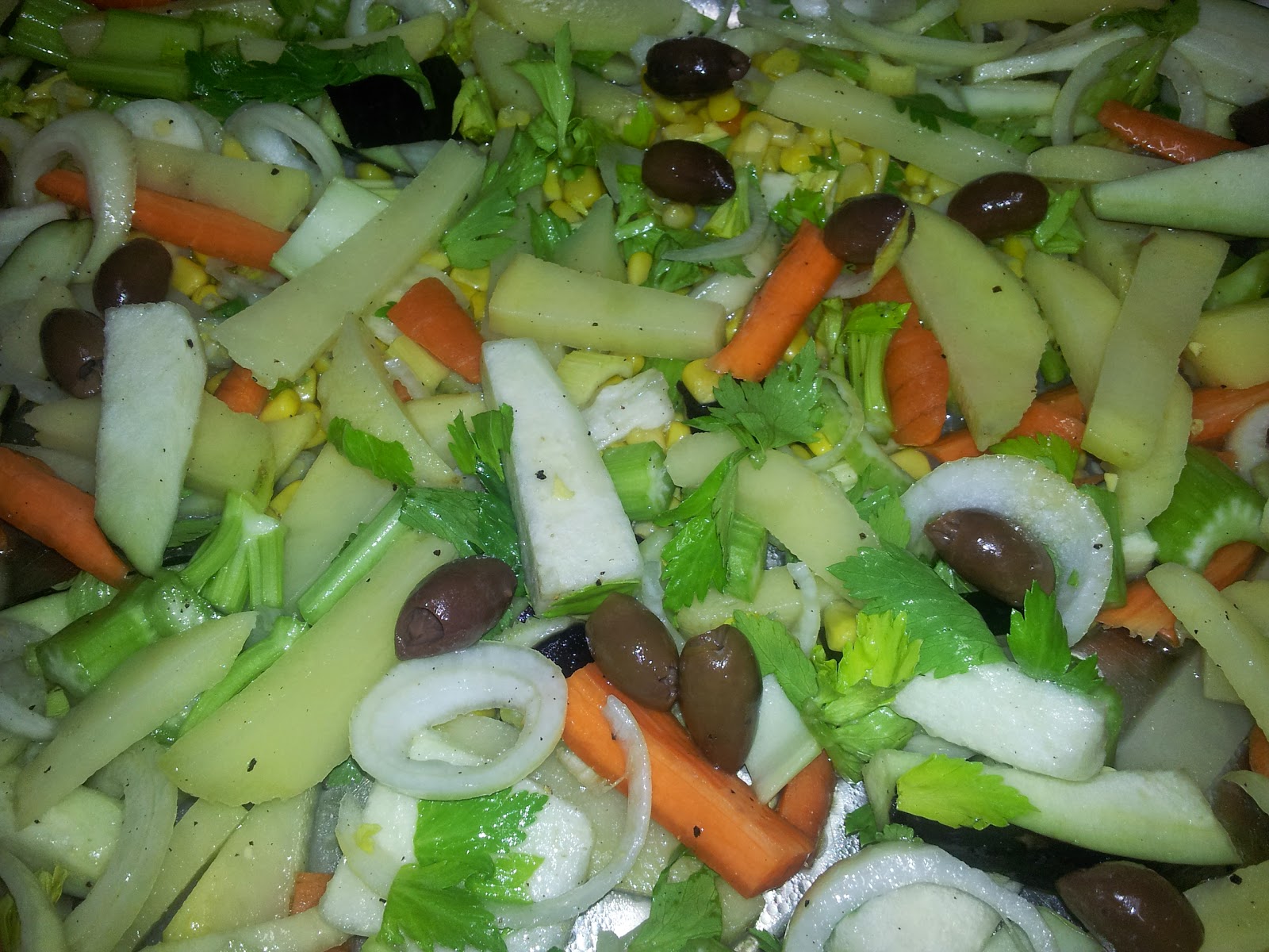 | TAGLIA 2 CAROTE, 2 PATATE, 1 MELANZANA E 1 ZUCCHINA MEDIA A FIAMMIFERO, 1 CIPOLLA A FETTE LASCIANDO GLI ANELLI INTERI, UNA MANCIATA DI OLIVE 1\2 BARATTOLO DI MAIS, 1 BEL MAZZETTO DI SEDANO |