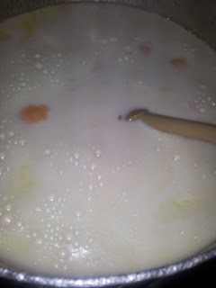 | IN UN TEGAME CUOCERE IL GRANO( 500 g)CON LO ZUCCHERO(600 g), IL BURRO( una noce) E IL SUCCO DI ARANCE( 100 ml) |