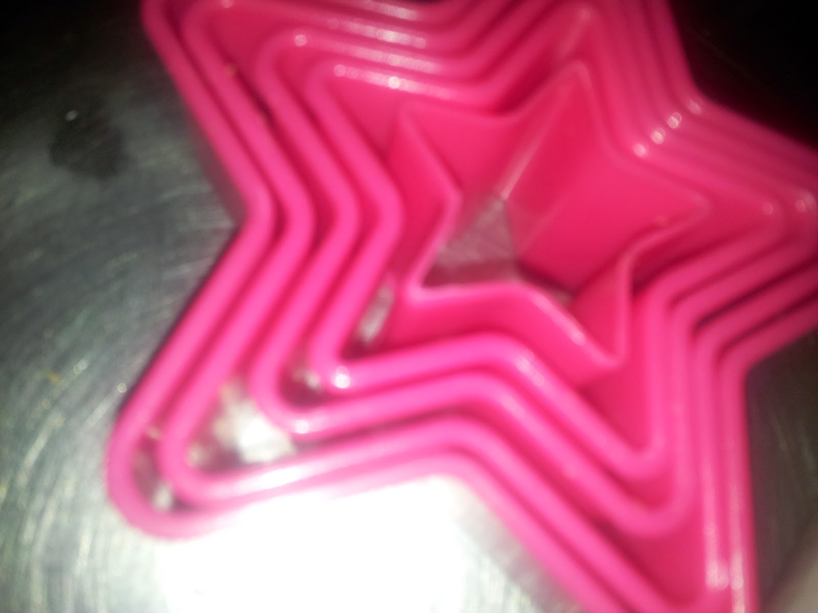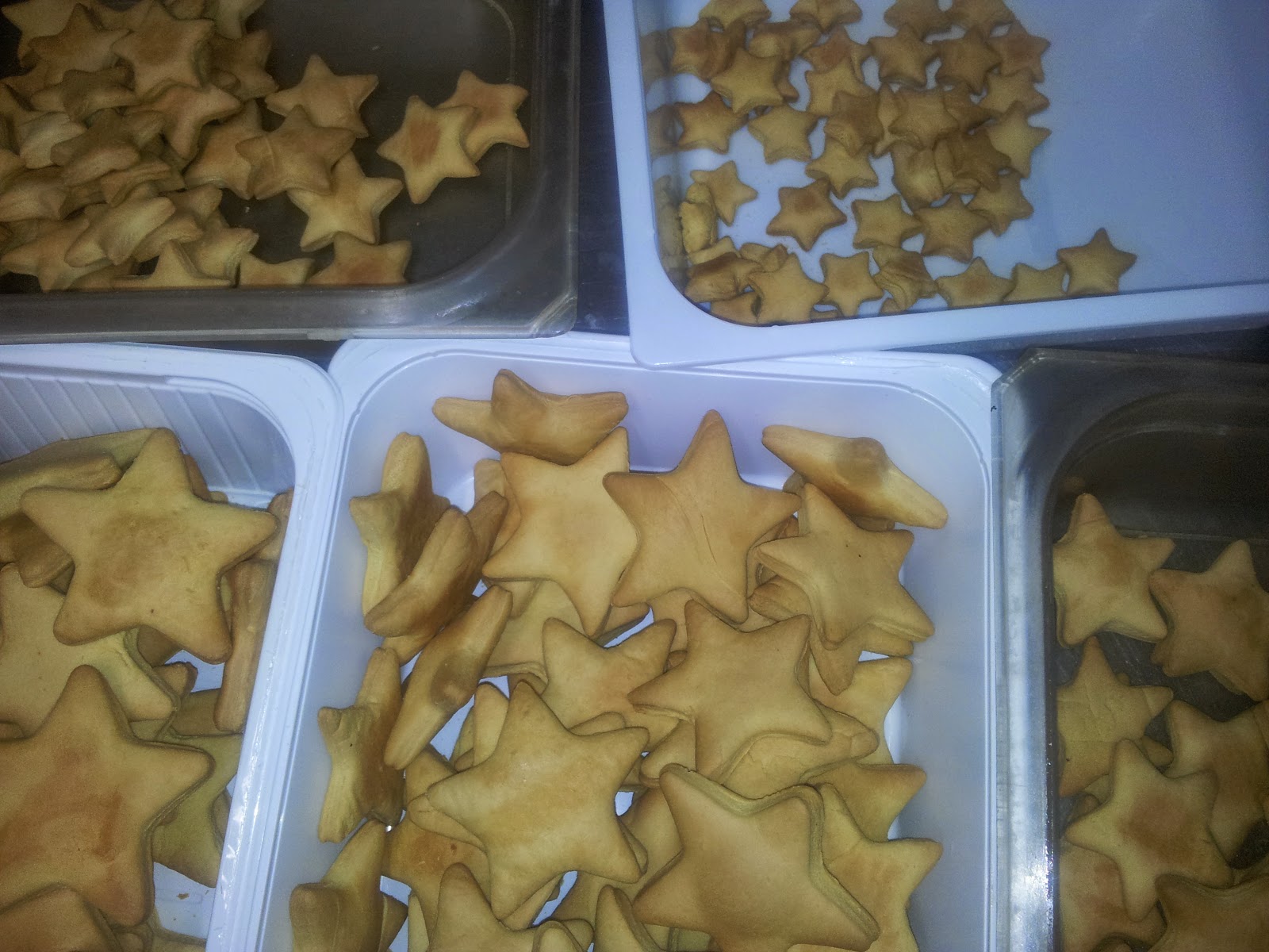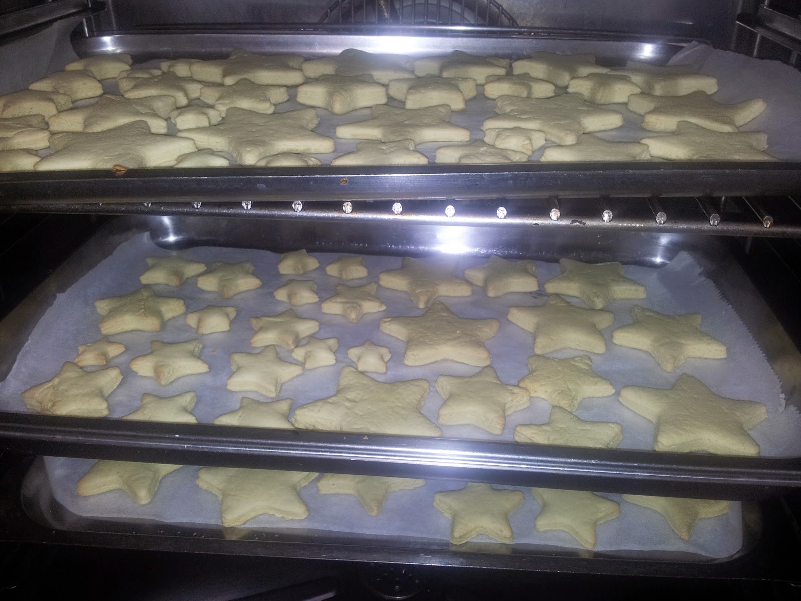 | IMPASTARE GLI INGREDIENTI, STENDERE IN UNA SFOGLIA DI CIRCA 1\2 CM DI SPESSORE E TAGLIARE CON IL TAGLIABISCOTTI A STELLA DAL PIù PICCOLO AL PIù GRANDE |