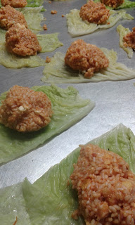 | METTERE UNA BELLA PALLA DI RISO SULLA FOGLIA DI VERZA COTTA. AL CENTRO DELLA " POLPETTA " DI RISO METTERE UNA FETTA DI MOZZARELLA |