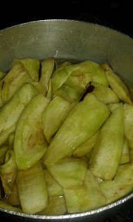 | IL MATTINO DOPO METTI IN UNA PENTOLA L'ACQUA, L'ACETO E UNA PRESA DI SALE. QUANDO ARRIVA AD EBOLLIZIONE BUTTARE LE MELANZANE NELLA PENTOLA. LASCIARE SBOLLENTARE QUALCHE MINUTO.... |