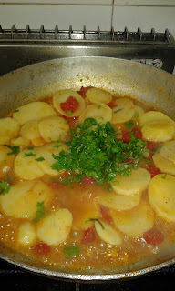 | TOGLIERE L'AGLIO E AGGIUNGERE LE PATATE A FETTE. SALARE MODERATAMENTE E PEPARE. SE PIACE AGGIUNGERE IL PEPERONCINO A DISCAPITO DEL PEPE. |