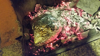 | NEL CAMINETTO SPOSTARE LA BRACE E MESCOLARLA ALLA CENERE. SCAVARE UN "BUCO" EMETTERCI IL POLLO... |